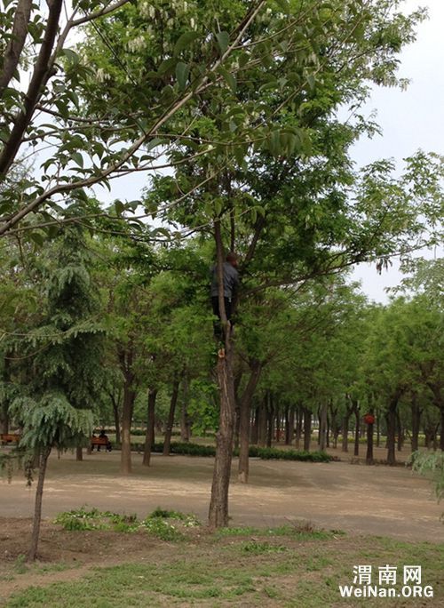 路过渭清公园,看到有老年人为了采摘槐花上了树……只为了一饱口欲,就无公德心地用自制工具毁坏了很多树枝。