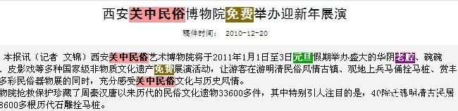 2010年12月20日,“三秦都市报”报道了,关中民俗馆于在2011年1日至3日元旦假期举办免费展演活动。今天(元旦)早上当大批群众冒着严寒赶到民俗馆时,却被告知并没有免费,而且和平时一样,120元的门票一分也不能少.