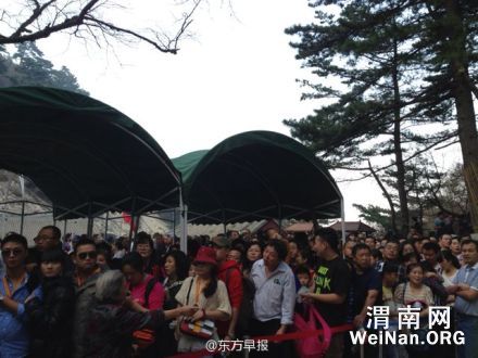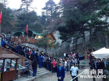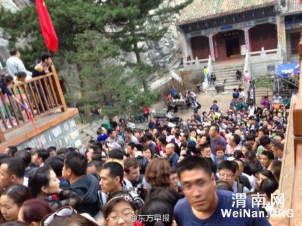 【华山索道出现拥堵】看完日出从西峰索道下山的游客目前排起长队,执勤人员奋力维护秩序以防踩踏,预计人流高峰需至晚上9点左右才能缓解。体弱的老人可以由一人陪同先下山。