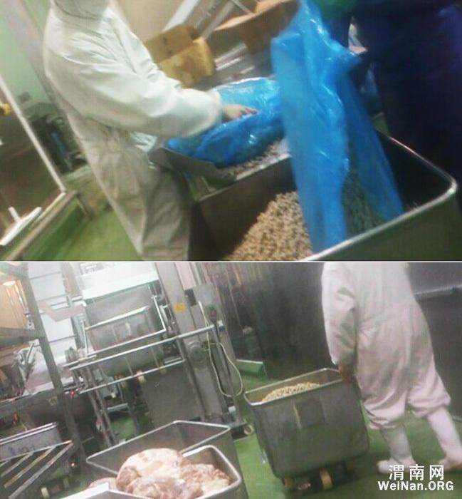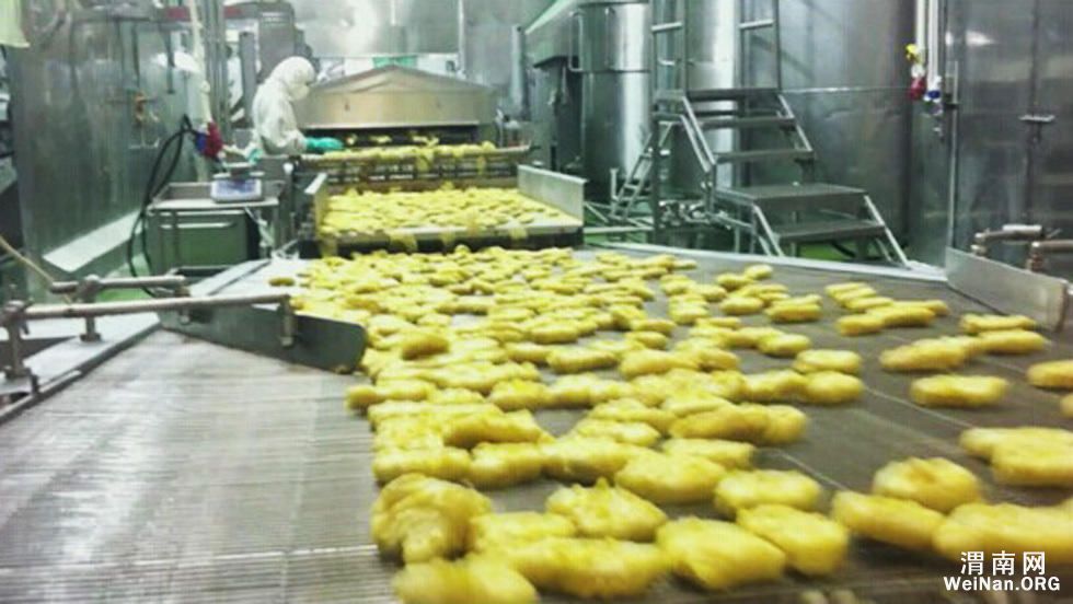 过期半个月的冰鲜鸡皮和鸡胸肉被掺入原料当中,制成黄灿灿的“麦乐鸡”。