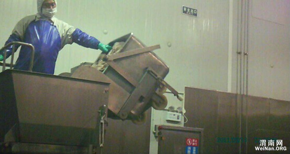 记者调查发现,2014年6月18日,18吨过期半个月的冰鲜鸡皮和鸡胸肉被掺入原料当中,制成黄灿灿的“麦乐鸡”。记者还获悉,这些过期鸡肉原料被优先安排在中国使用。另外,肯德基的烟熏肉饼同样使用了过期近一个月的原料。图为工人将过期原料倒在拆肉区操作台上。