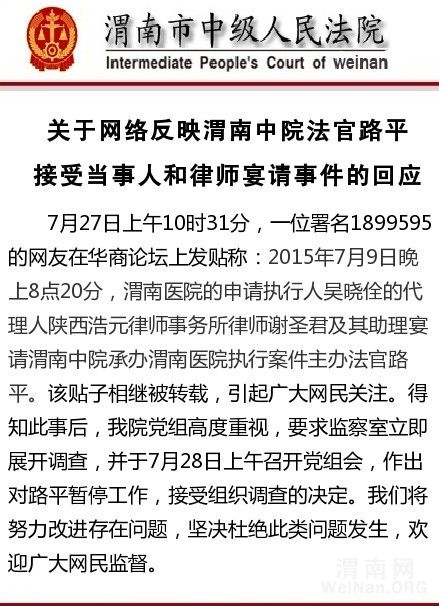 7月28日,网友爆料的第二天中午,渭南中院在其官微上发布《关于网络反映渭南中院法官路平接受当事人接受律师宴请事件回应》。《回应》中称,“得知此事后,我院党组高度重视,要求监察室立即展开调查,并于7月28日上午召开党组会,做出对路平暂停工作,接受组织调查的决定。我们将努力改进存在问题,解决杜绝此类问题的发生,欢迎广大网民监督。”