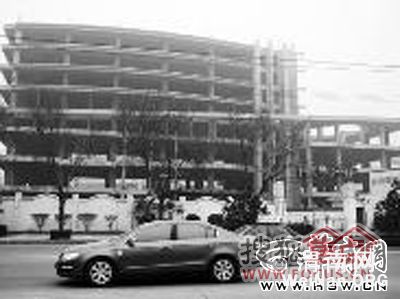 1月10日上午,记者驱车沿着朝阳大街从东向西走,远远就看到街道北边的这幢烂尾楼,楼体南边呈弧形,共8层;东边4层,呈方形。楼房工程部的简易房墙上及铁门上,有承建商“汕建实业”字样。透过锈迹斑斑的铁门洞孔望进去,院内杂草丛生,放着简易建筑机械。